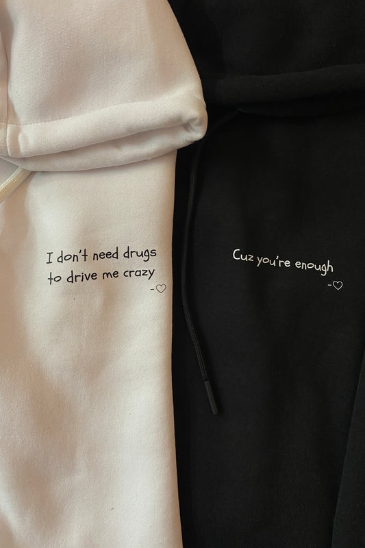 Print in front and custom Roman date on sleeves (I don’t need drugs to drive me crazy, coz you’re enough) Matching Hoodies