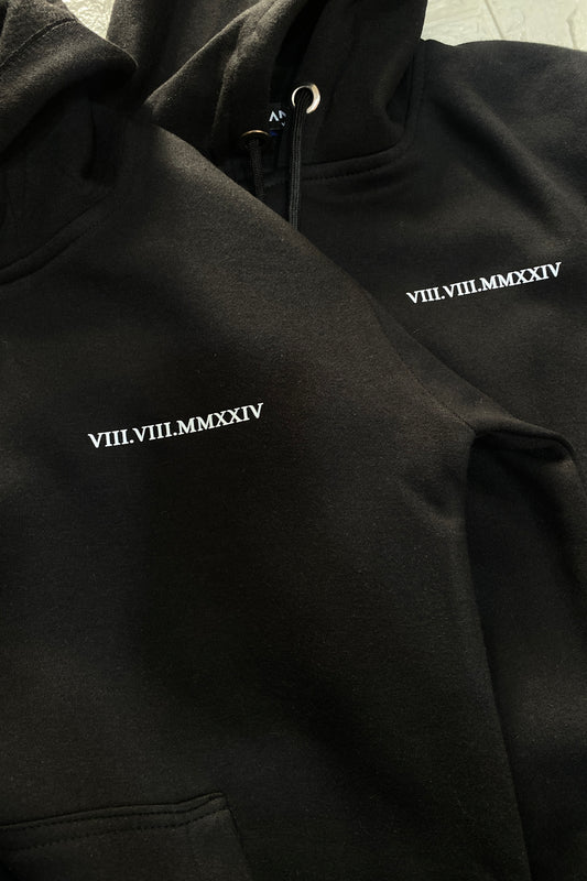 Pack of 2: Custom line art with Roman date Matching Hoodies and Text on sleeves (Printed)