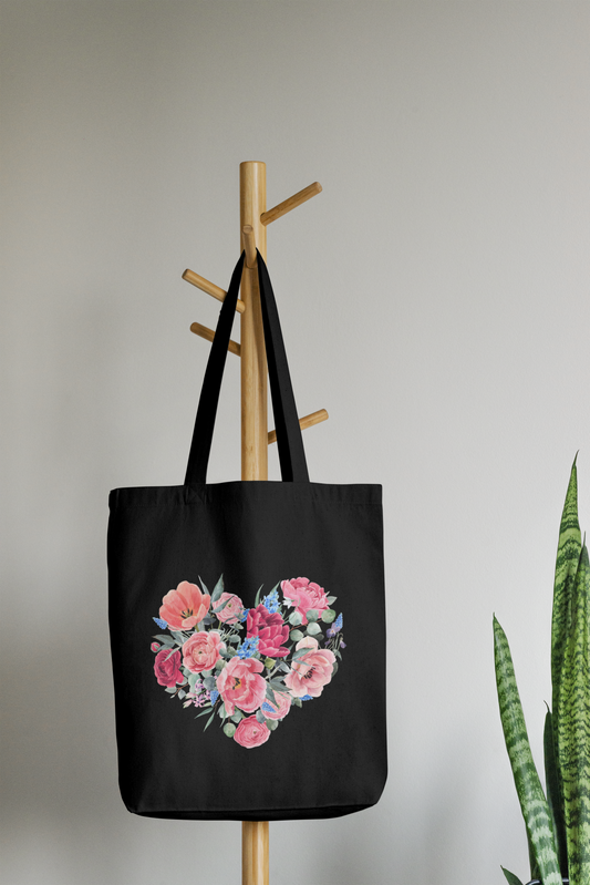 Black/White Aesthetic Floral Heart Tote Bag with Zipper