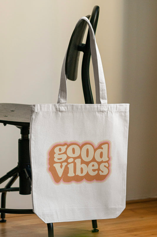 Black/White Good Vibes Typography Tote Bag with Zipper