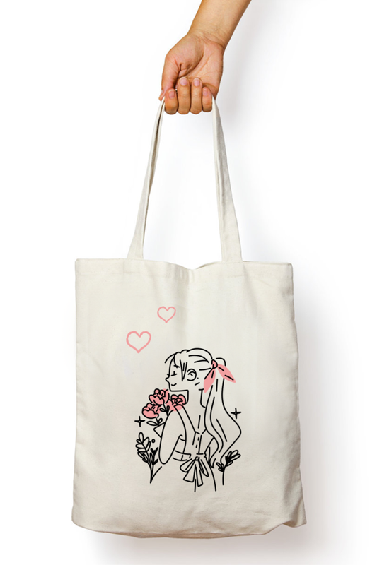 White Aesthetic Tote Bag with Zipper ( Girl with a bouquet )