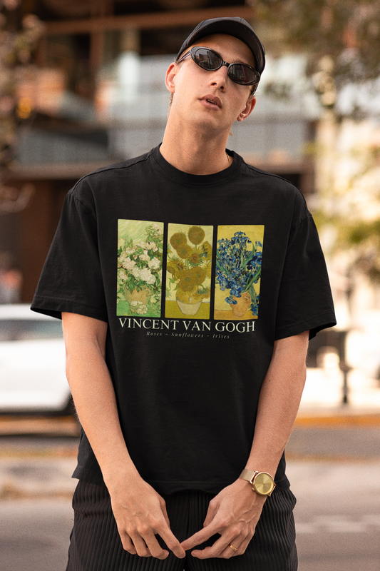 Vincent Van Gogh (Roses, Sunflowers & Irises) Graphic Printed Unisex Black Oversized T Shirt
