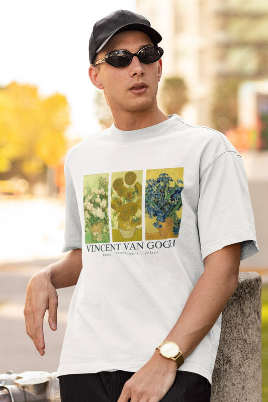 Vincent Van Gogh (Roses, Sunflowers & Irises) Graphic Printed Unisex White Oversized T Shirt