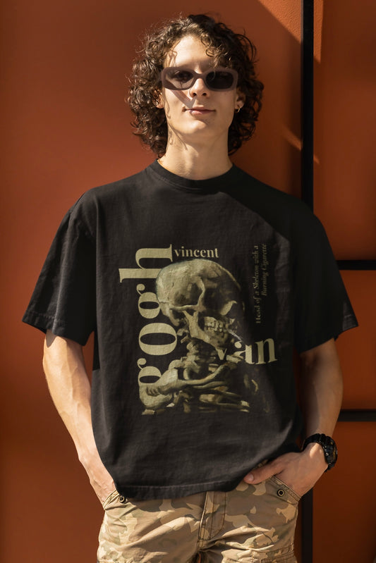 Skull of a Skeleton with Burning Cigarette (Vincent Van Gogh) Graphic Printed Unisex Black Oversized T Shirt